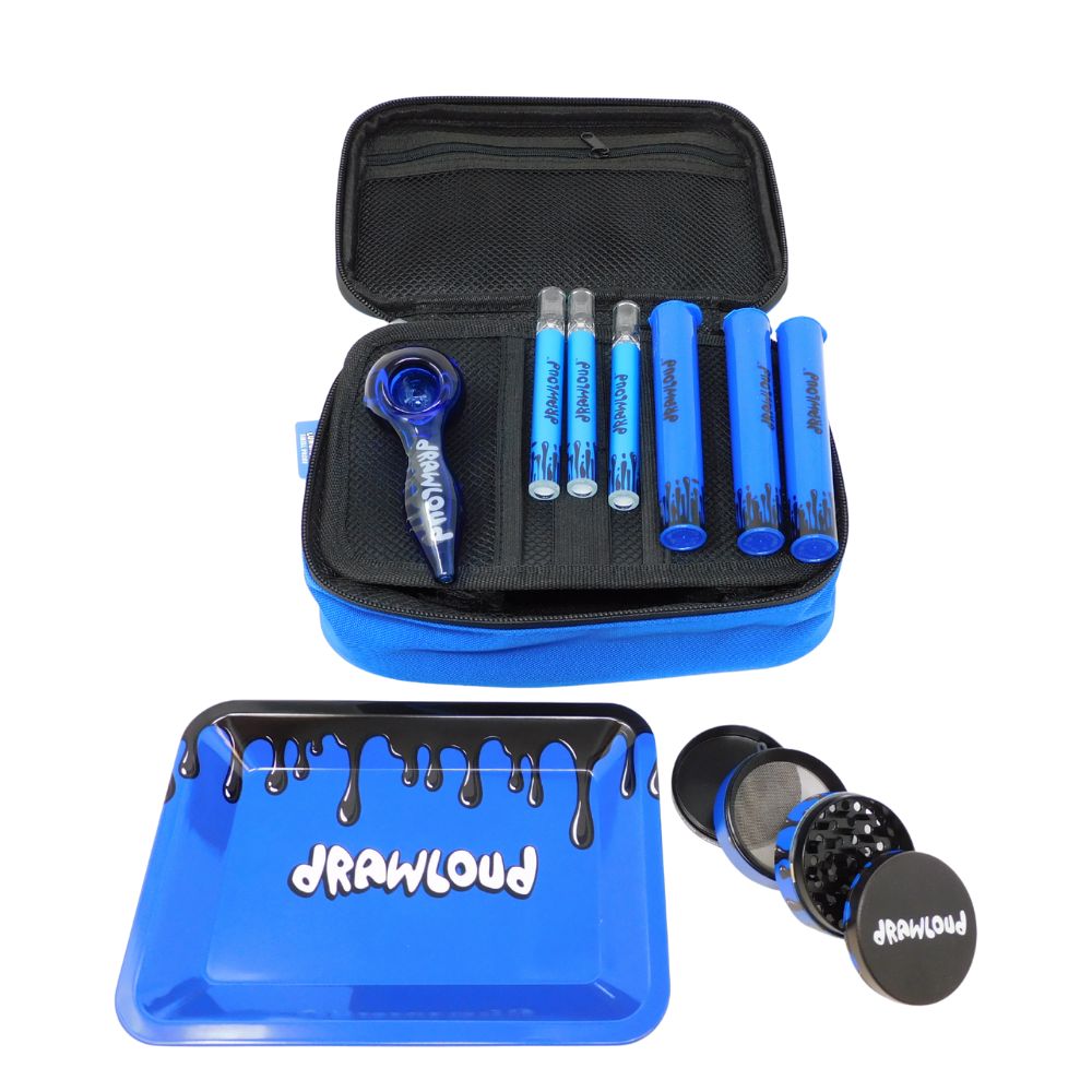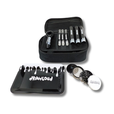The Drawloud Smell Proof Lunchbox Bag combines discreet style with practicality, featuring screen-printed canvas and a sturdy top handle for easy carrying. Its odor-blocking mesh interior includes multiple pouches, a removable divider, and adjustable padded inserts to keep your items secure and quiet. Equipped with a full zip closure and a branded pull tab that says "Stay quiet," this bag ensures privacy and convenience. Perfectly sized and organized, it holds essential accessories like a metal rolling tray, chillums, joint tubes, glass pipe, metal grinder, and storage case — all ready for your on-the-go needs.